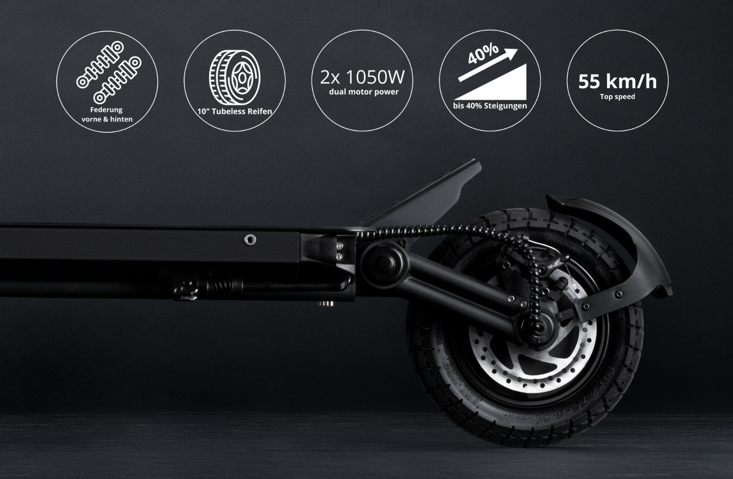 Mit einer beeindruckenden Höchstgeschwindigkeit von 55 km/h liefert der R55 PRO ein unvergleichbares Fahrerlebnis. Der E-Scooter kann sowohl nur als Heckantrieb als auch im Dual-Mode Front- und Heckantrieb gefahren werden. Die drei unterschiedlichen Speedmodes ermöglichen eine Fahrt bei ca. 20 km/h - 40 km/h und - 55 km/h. Bitte beachte, dass dieser E-Scooter nur auf privatem Gelände gefahren werden darf.
