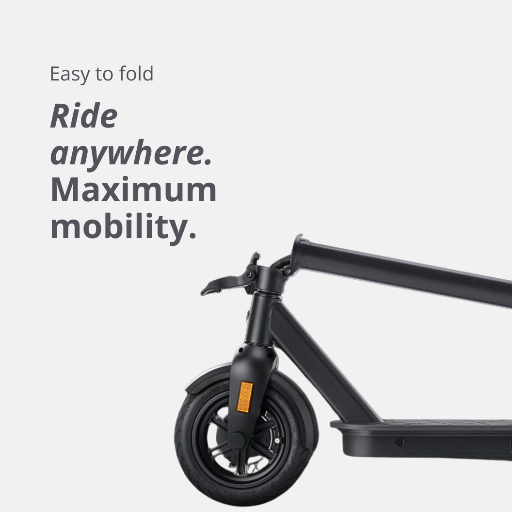 Tieni presente che l'autonomia massima dell'e-scooter è determinata in condizioni ideali. Queste includono temperatura esterna di 20-25 °C, peso del ciclista di 75 kg, percorso pianeggiante, stile di guida costante, pochi stop and go, modalità di guida Eco a 20 km/h, pressione degli pneumatici di 3,0 bar. Nell'uso pratico, più ci si discosta dalle condizioni ideali, più l'autonomia effettiva può variare.